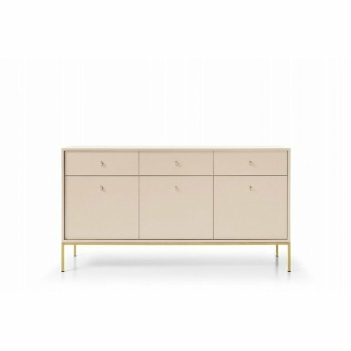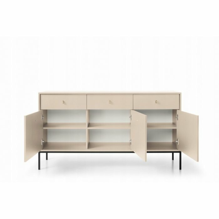 Wysoka jakość użytych w produkcji komponentów pływa na wieloletnią trwałość mebla. Stylizowane uchwyty, a także czarne lub złote metalowe nóżki, zwracają na siebie uwagę licznych odbiorców. Są to meble modułowe, więc można je dowolnie zestawiać. W ramach kolekcji odnajdą Państwo eleganckie komody, stolik kawowy, biurko, stolik RTV czy półkę wisząca. Dostępność tak szerokiego asortymentu pozwala wyposażyć każde wnętrze.