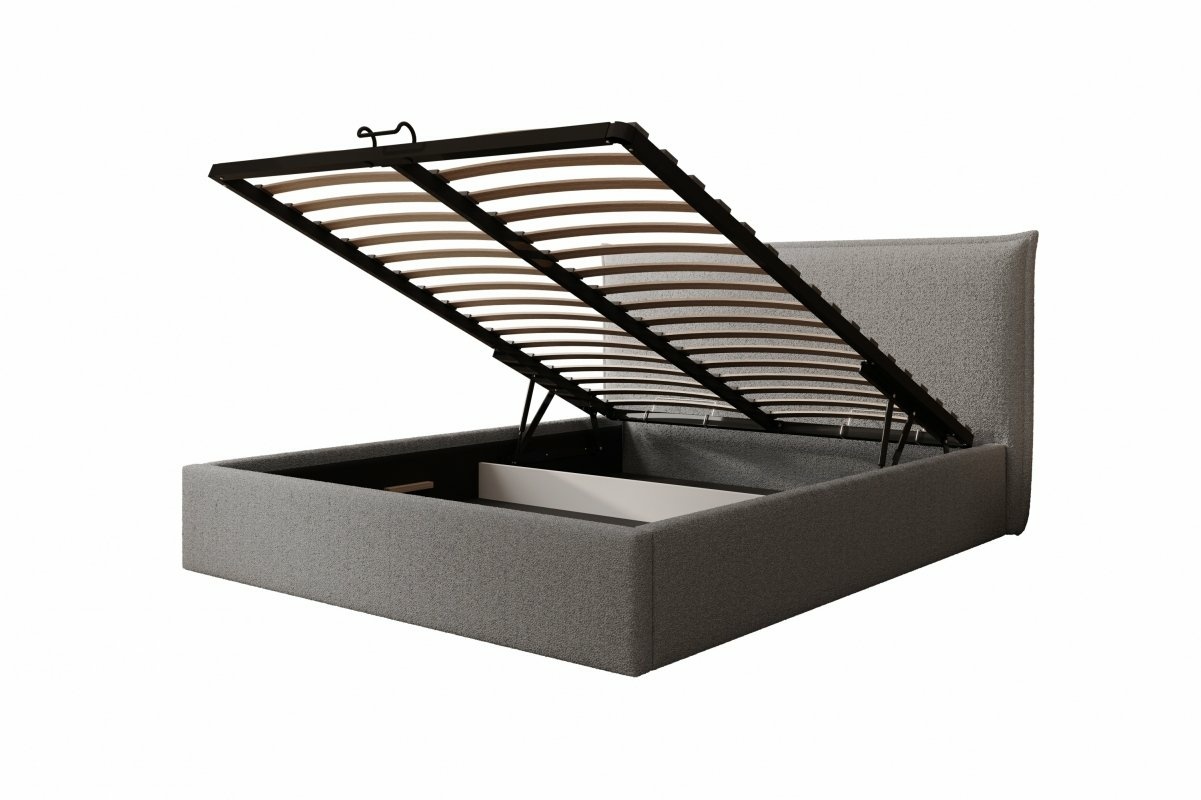 Łóżko Alena wyposażone jest w praktyczny pojemnik na pościel, który umożliwia wygodne przechowywanie koców, poduszek i innych tekstyliów. Pojemnik wykonany jest z tapicerskiej podbitki, co zapewnia estetyczne wykończenie wnętrza łóżka. To rozwiązanie pozwala lepiej wykorzystać przestrzeń sypialni i utrzymać porządek na co dzień.