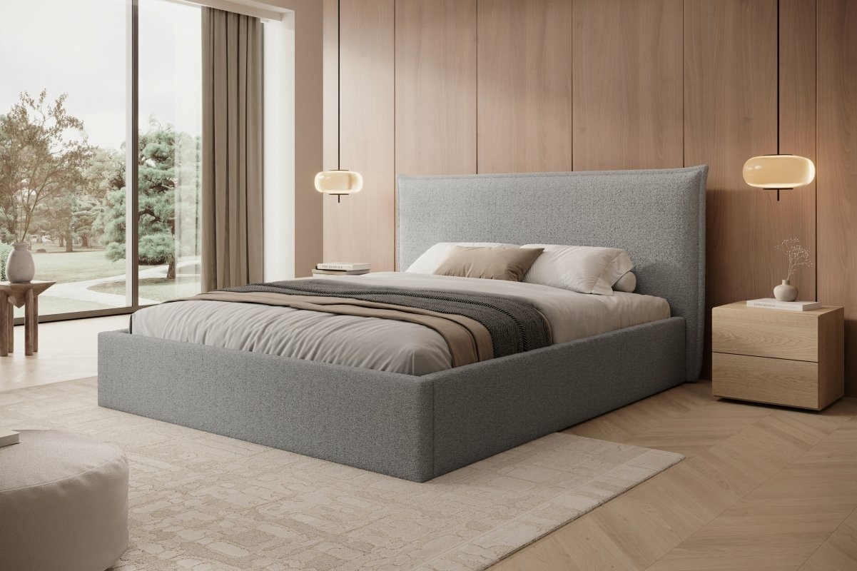 Alena to tapicerowane łóżko o smukłej, minimalistycznej bryle, zaprojektowane z myślą o nowoczesnych i uporządkowanych wnętrzach. Cienkie boki i przodek nadają całości lekkości wizualnej, a wyraźnie zaznaczone zagłowie zapewnia wygodne oparcie i eleganckie wykończenie. Praktyczny pojemnik na pościel pozwala efektywnie wykorzystać przestrzeń sypialni, bez zaburzania prostej formy mebla.