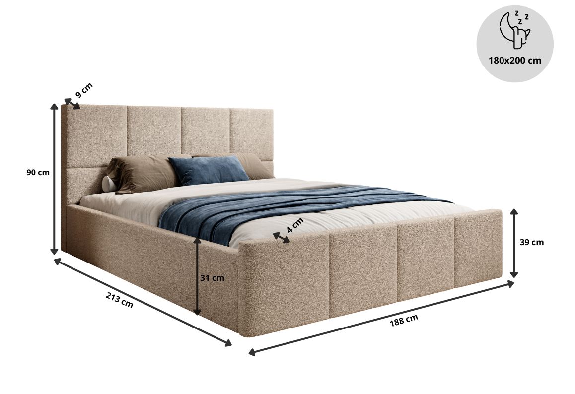 • Tapicerowana rama i wezgłowie – miękkie wykończenie zwiększające wygodę użytkowania.
