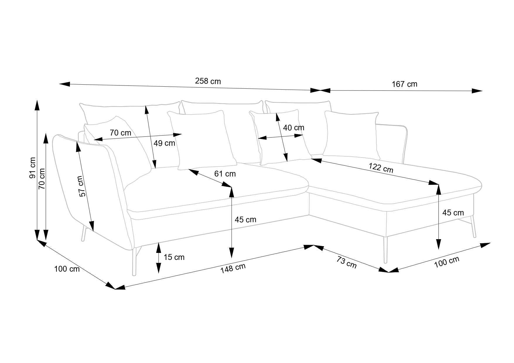 Narożnik Merle został zaprojektowany z myślą o maksymalnym komforcie. W zestawie znajdują się wszystkie poduszki, które doskonale dopełniają całość. Wymiary poduszek: