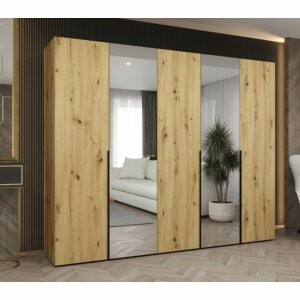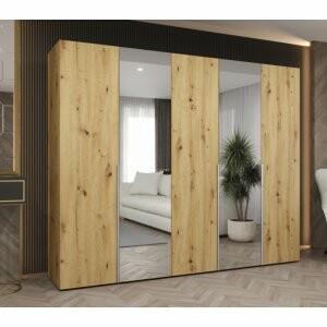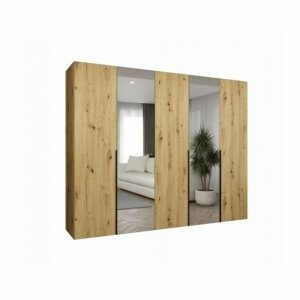 Szafa Almera Lux 250 w dekorze dąb artisan to elegancki i przestronny mebel, który łączy naturalne piękno drewna z funkcjonalnością nowoczesnych rozwiązań. Ciepły odcień inspirowany drewnem sprawia, że wnętrze staje się bardziej przytulne, a dwa wysokie lustra na frontach nadają lekkości i wizualnie powiększają pomieszczenie.