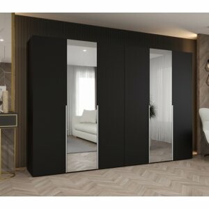 Szafa Almera Lux 300 w kolorze czarny mat to największy model w kolekcji, który zachwyca elegancją i imponującą pojemnością. Minimalistyczny design w połączeniu z dwoma dużymi lustrami na frontach sprawia, że mebel jest nie tylko niezwykle funkcjonalny, ale także dekoracyjny – rozświetla pomieszczenie i optycznie je powiększa.