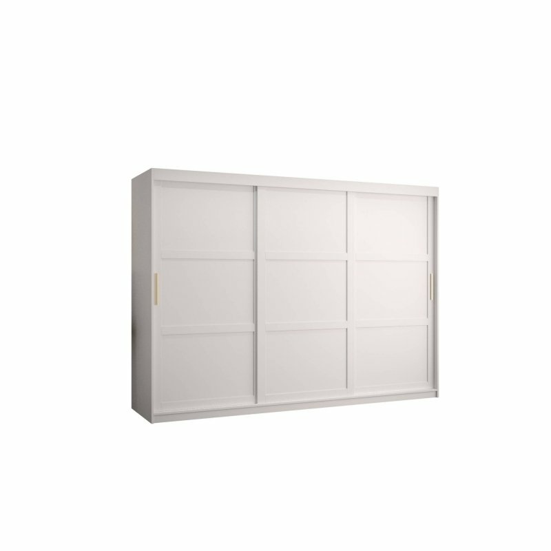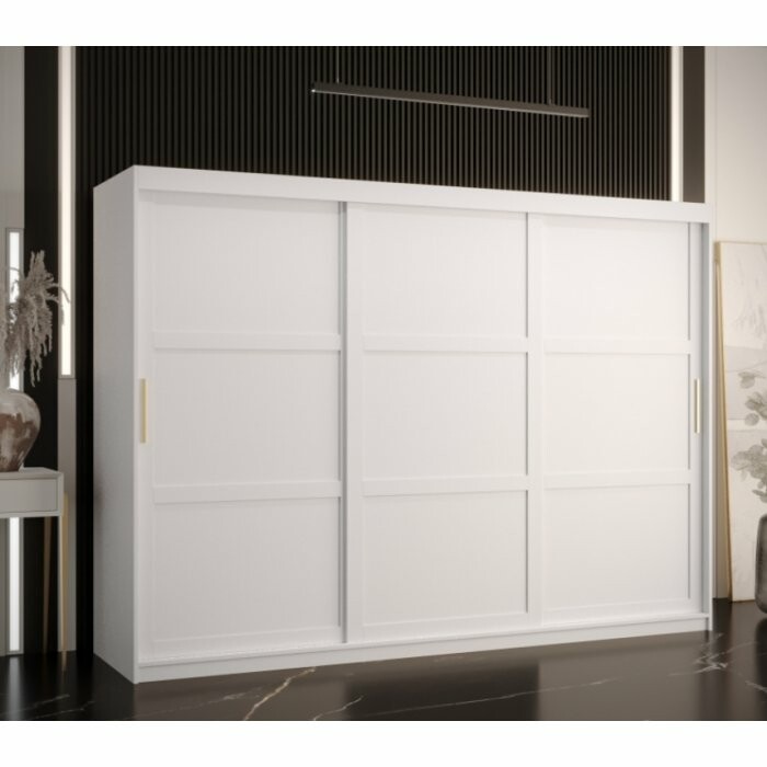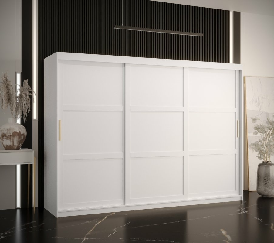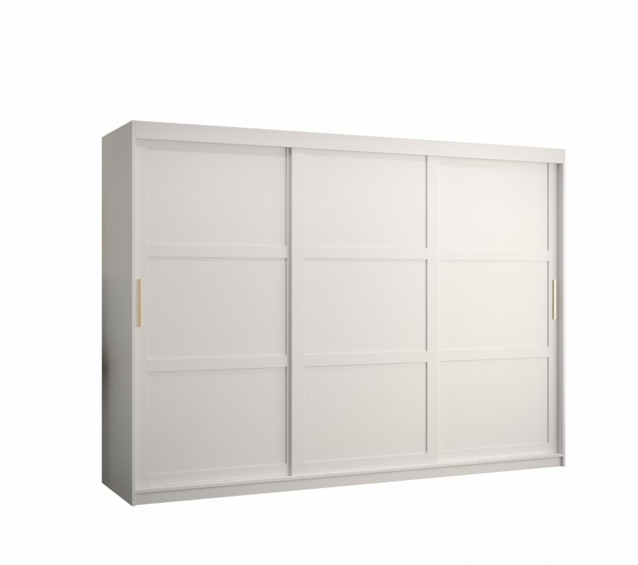 Ferano 250 to największa i najbardziej imponująca szafa z kolekcji – trzy fronty przesuwne zapewniają pełen dostęp do całej zawartości, a przemyślany układ z półkami po bokach i drążkami pośrodku pozwala doskonale zorganizować ubrania i dodatki. To mebel stworzony do dużych sypialni i garderób, który łączy pojemność, elegancję i funkcjonalność.