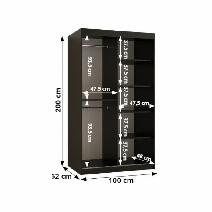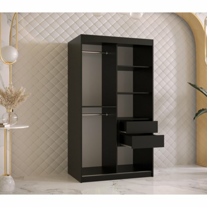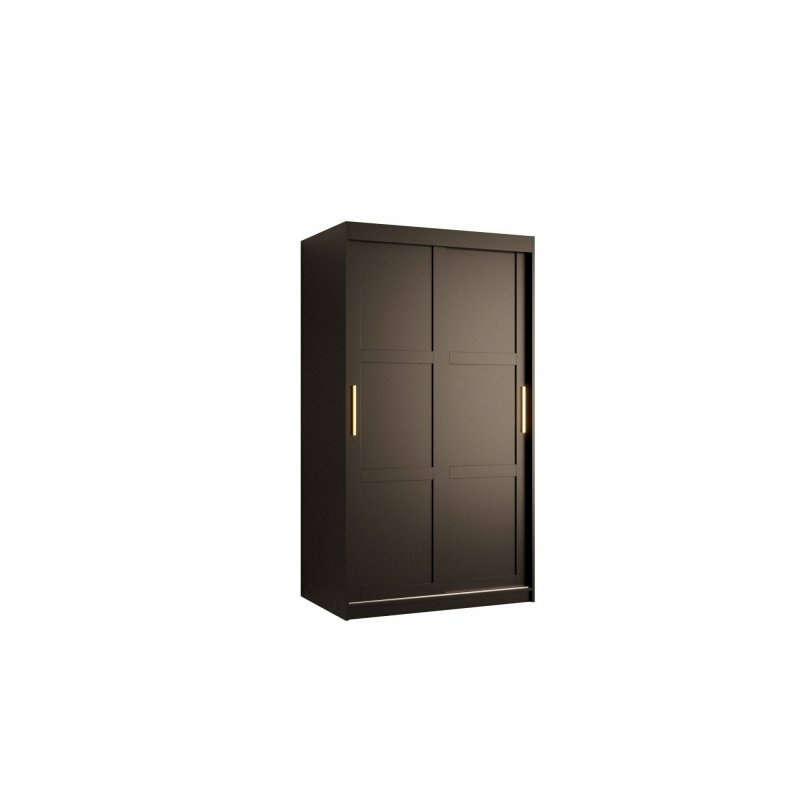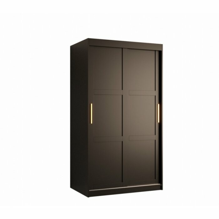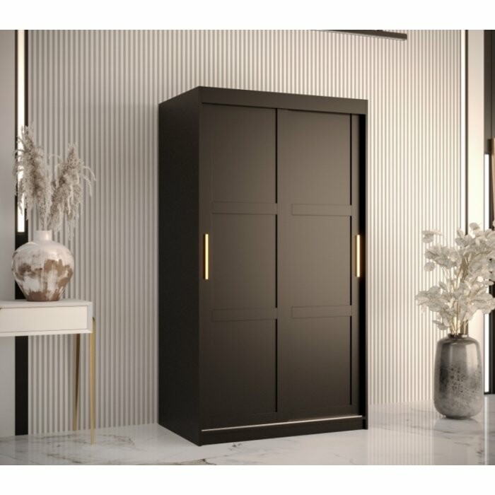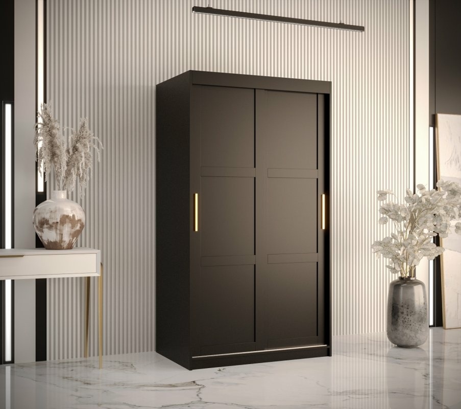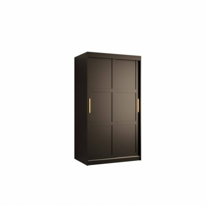 Ferano 100 w kolorze czarny mat to elegancka, kompaktowa szafa, która doskonale wpasuje się w nowoczesne wnętrza. Czarny mat nadaje jej wyjątkowego charakteru, a frezowane fronty i złote uchwyty dodają szyku. Idealny wybór dla osób, które potrzebują funkcjonalnej szafy przesuwnej o niewielkiej szerokości, ale nie chcą rezygnować z eleganckiego wyglądu.