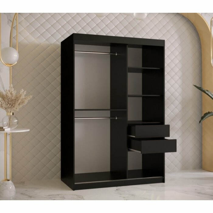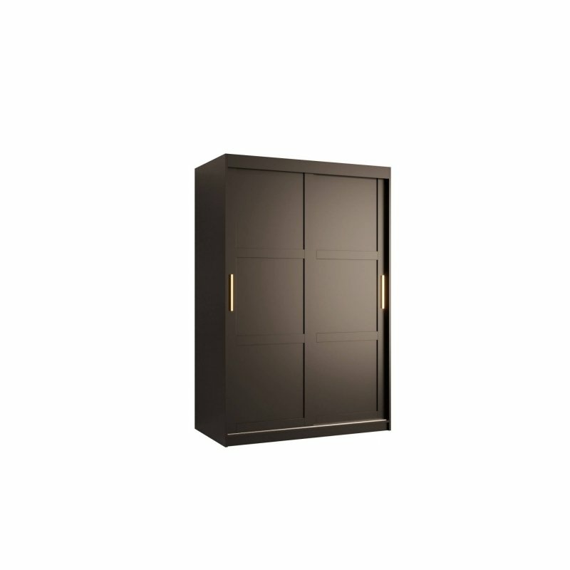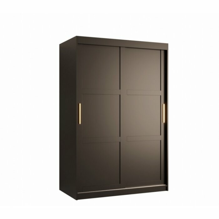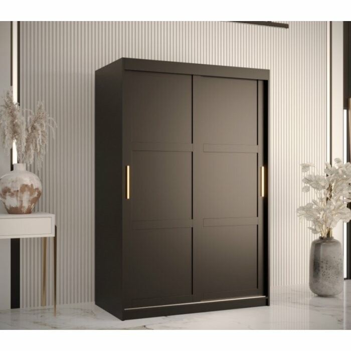 Ferano 120 w kolorze czarny mat łączy elegancję z funkcjonalnością. Jej frezowane fronty w czarnym macie prezentują się wyjątkowo nowocześnie, a złote uchwyty dodają luksusowego charakteru. Dzięki przemyślanemu wnętrzu z półkami i drążkami szafa ułatwia zachowanie porządku, a możliwość montażu szuflad i samodomykacza pozwala dostosować ją do własnych potrzeb.