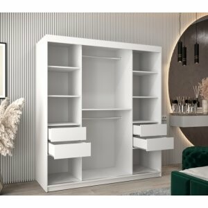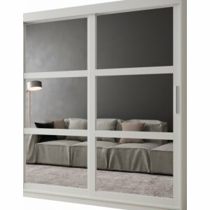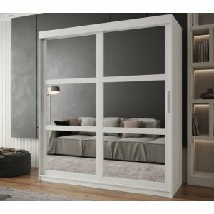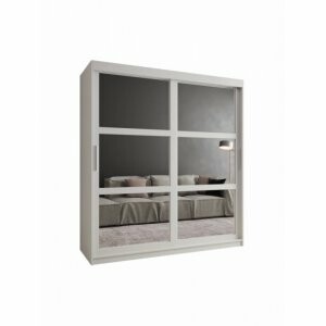 Szafa Gloss 180 biały mat to wyjątkowo pojemny model, idealny do większych sypialni lub garderób. Jasny korpus i lustrzane fronty powiększają optycznie przestrzeń, a system drzwi przesuwnych pozwala na wygodne korzystanie z mebla bez zajmowania dodatkowego miejsca.