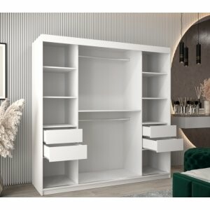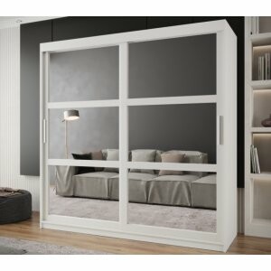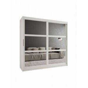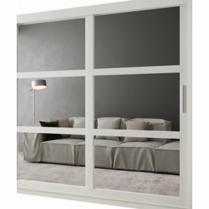 Szafa Gloss 200 biały mat to przestronny i elegancki model, który pomieści garderobę nawet kilku osób. Lustrzane fronty dodają wnętrzu lekkości i wizualnie je powiększają, a drzwi przesuwne zapewniają wygodny dostęp do całej zawartości mebla, oszczędzając miejsce w pomieszczeniu.