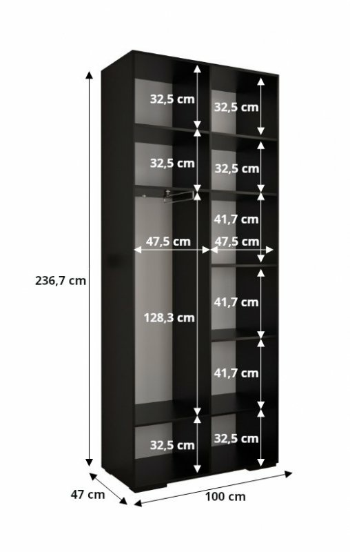 Duża, dwudrzwiowa szafa w eleganckim, matowym wykończeniu, idealna do nowoczesnych i minimalistycznych wnętrz. Dzięki szerokości 100 cm i wysokości 236,7 cm zapewnia dużo miejsca na ubrania, jednocześnie prezentując się stylowo i ponadczasowo.
