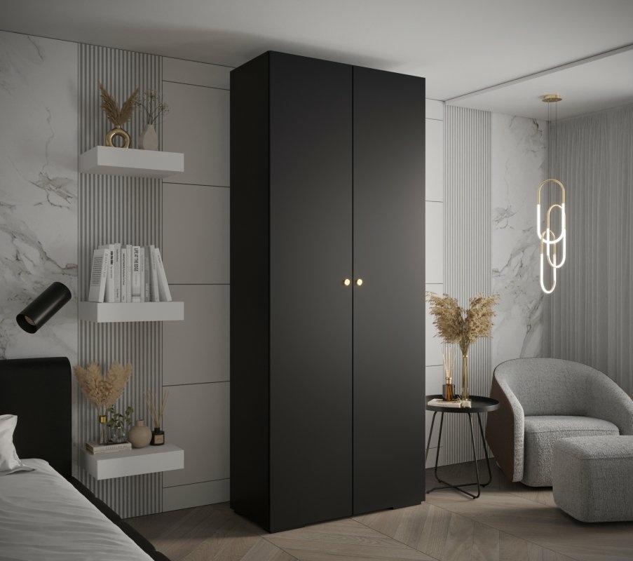 • Drzwi uchylne z okrągłymi, metalowymi uchwytami w kolorze złotym lub czarnym – do wyboru.
