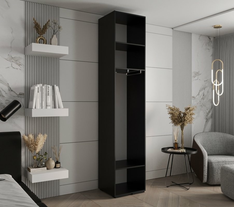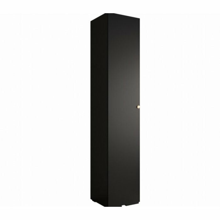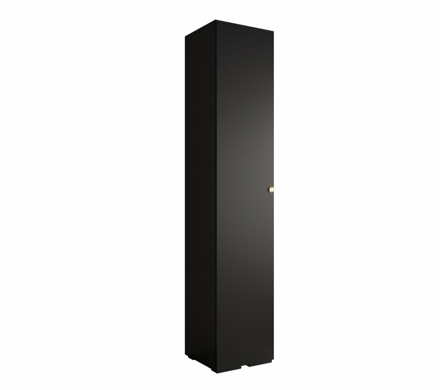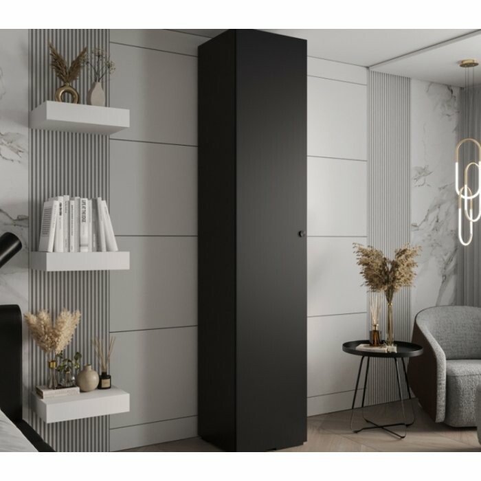 Elegancka, wąska szafa jednodrzwiowa w głębokim, matowym wykończeniu. Dzięki smukłej formie świetnie sprawdzi się w niewielkich pomieszczeniach, dodając im nowoczesnego charakteru.