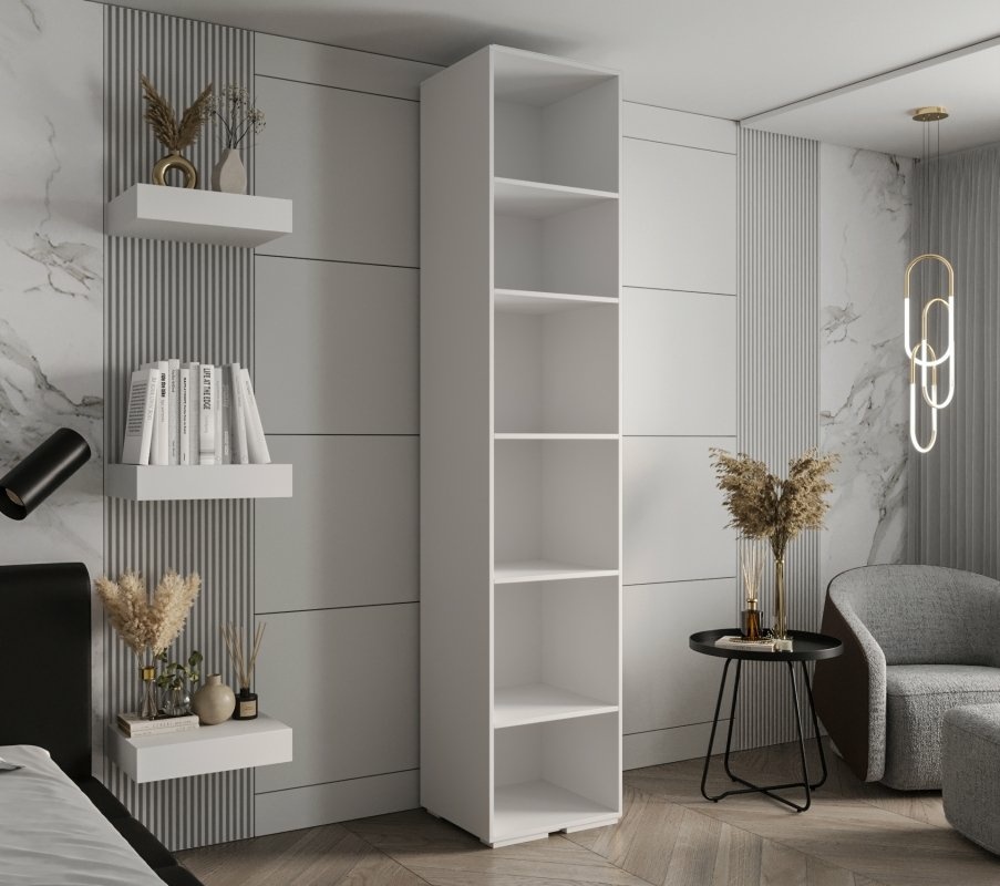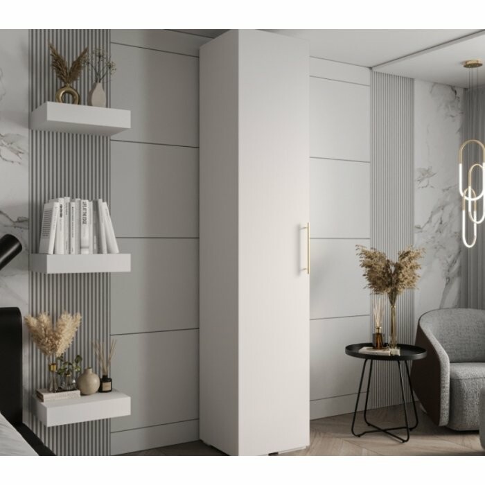 Smukła i elegancka szafa jednodrzwiowa z nowoczesnym uchwytem relingowym. Idealna do małych pomieszczeń – garderób, przedpokojów i sypialni – gdzie liczy się funkcjonalność i minimalistyczny design.
