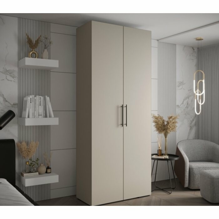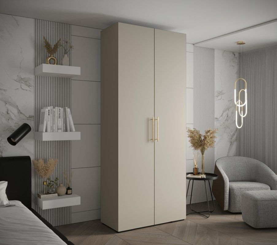 Pojemna, dwudrzwiowa szafa w modnym odcieniu kaszmiru, wyposażona w eleganckie uchwyty relingowe. To idealne rozwiązanie dla osób ceniących nowoczesny wygląd i dużą funkcjonalność. Doskonale sprawdzi się w sypialni, garderobie lub przedpokoju.