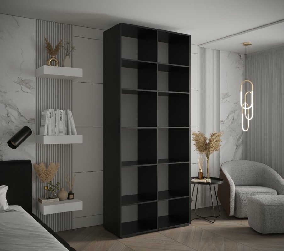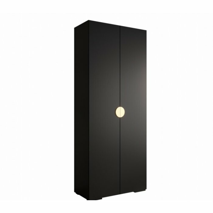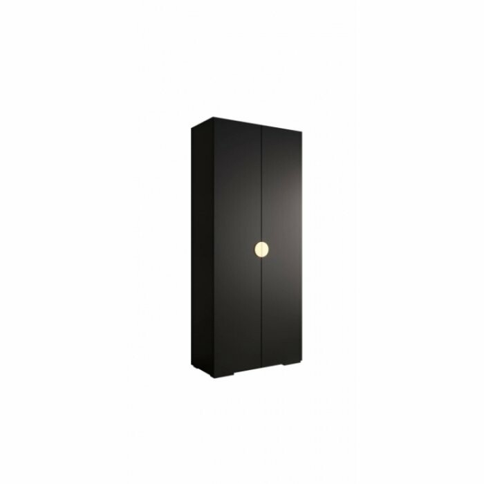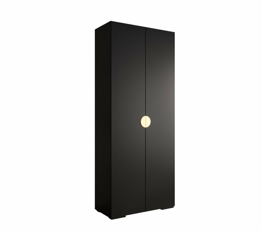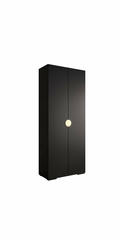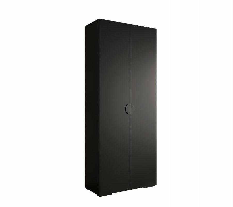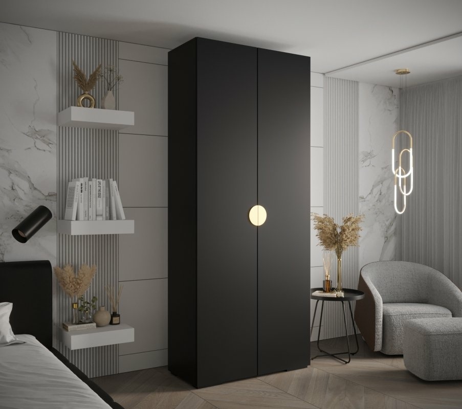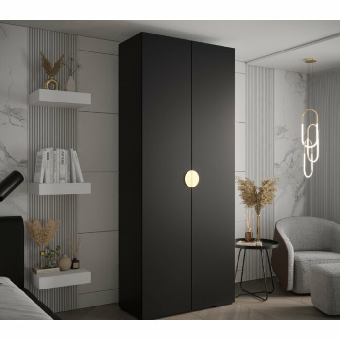Pojemna, dwudrzwiowa szafa w nowoczesnym czarnym macie z eleganckimi, półokrągłymi, wpuszczanymi uchwytami. Idealna do sypialni, garderoby lub przedpokoju – zapewnia dużo miejsca na ubrania, jednocześnie wprowadzając do wnętrza wyjątkowy, minimalistyczny charakter.