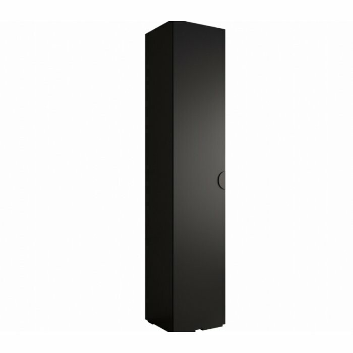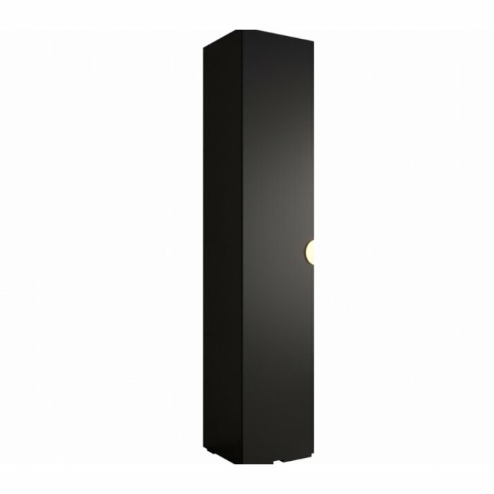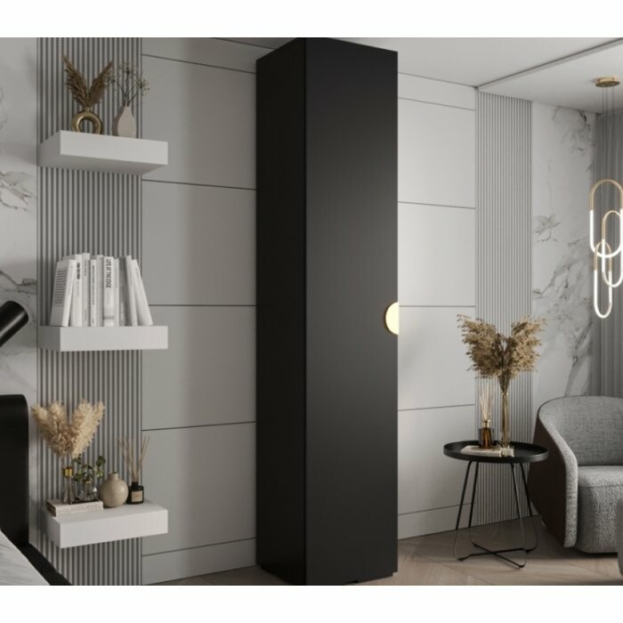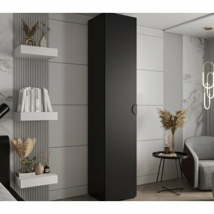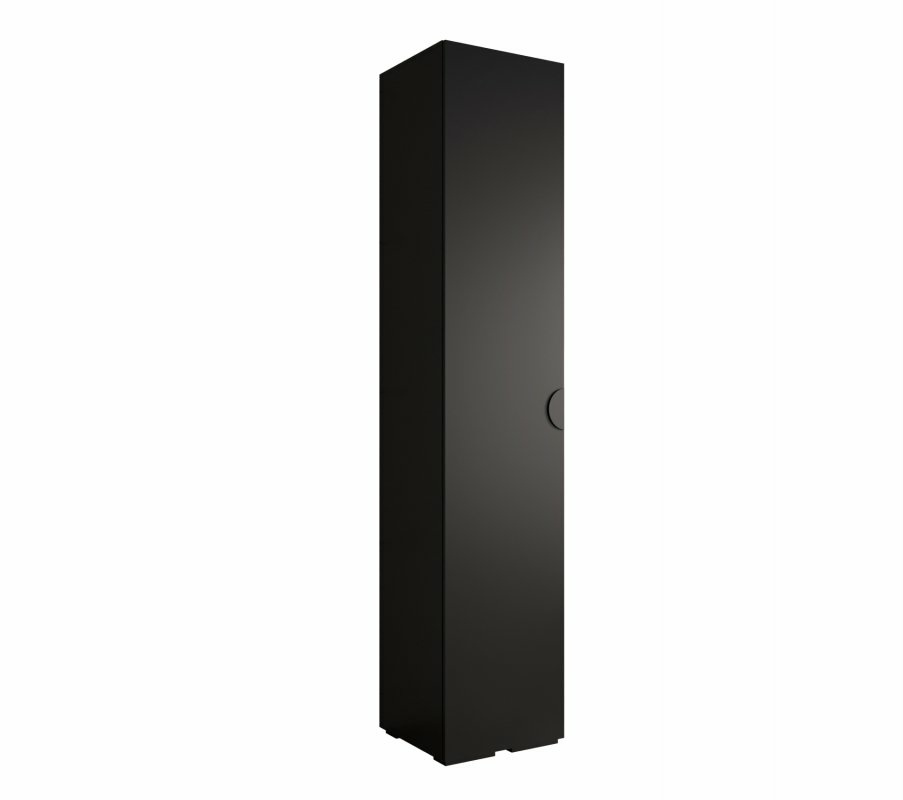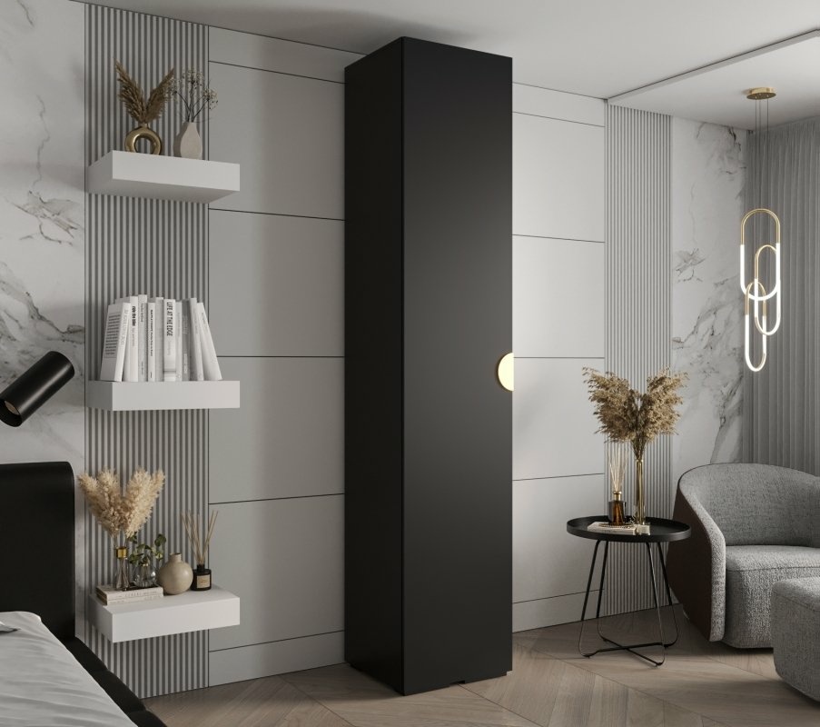 Smukła, jednodrzwiowa szafa w eleganckim, głębokim czarnym macie, wyposażona w charakterystyczny półokrągły, wpuszczany uchwyt. Idealna do nowoczesnych, minimalistycznych wnętrz, w których liczy się zarówno funkcjonalność, jak i stylowy wygląd.