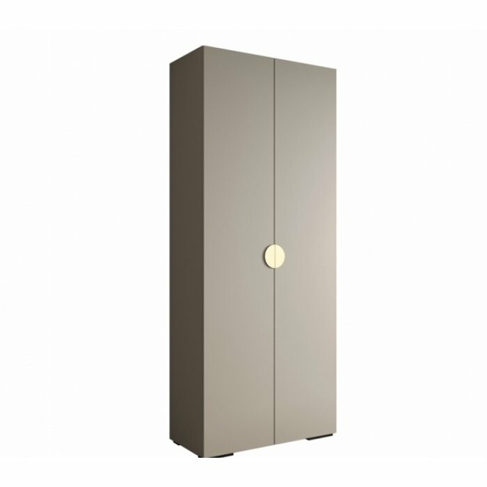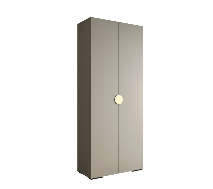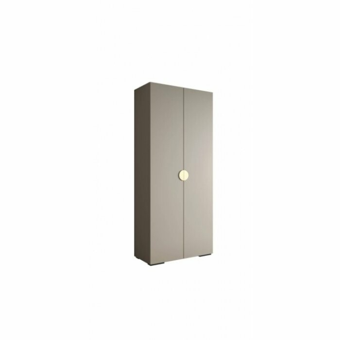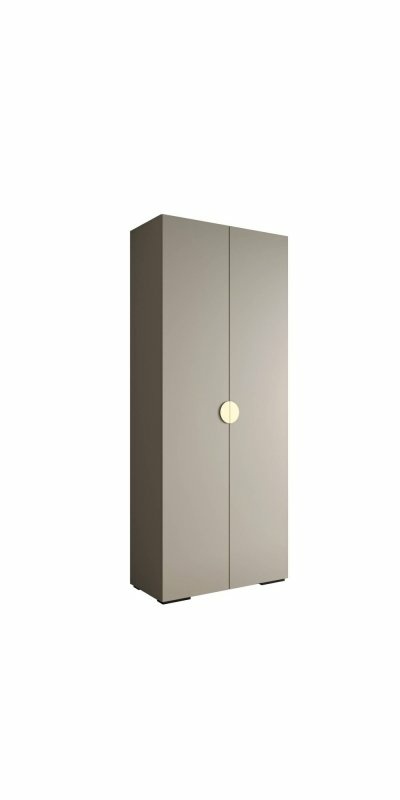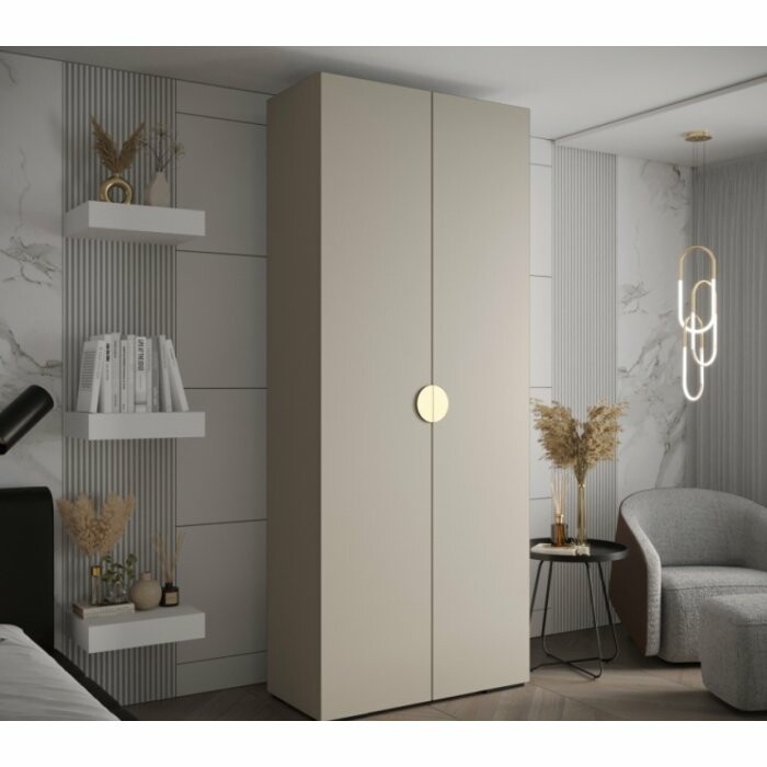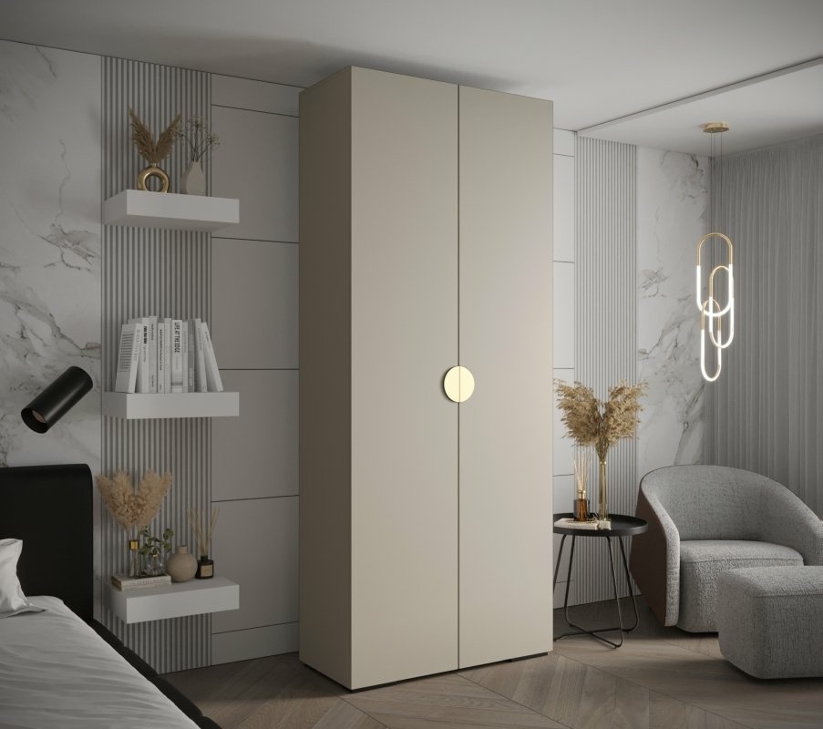 Pojemna, dwudrzwiowa szafa w modnym odcieniu kaszmiru, z eleganckimi, półokrągłymi, wpuszczanymi uchwytami. To nowoczesne rozwiązanie, które łączy funkcjonalność z estetyką, idealnie pasując do sypialni, garderoby czy przedpokoju.