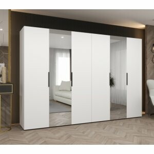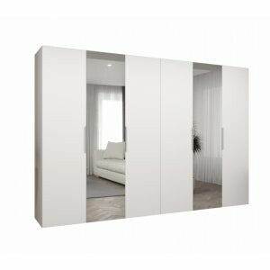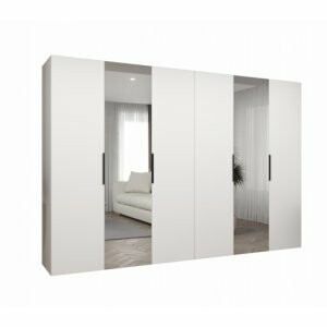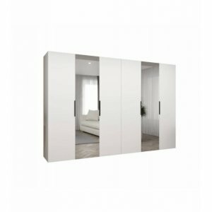 Szafa Lumera Lux 300 to największy model z kolekcji, stworzony z myślą o przestronnych wnętrzach. Fronty w kolorze białego matu urozmaicone zostały dwoma dużymi lustrami, które podkreślają nowoczesny charakter mebla, a jednocześnie optycznie powiększają i rozświetlają pomieszczenie.