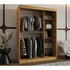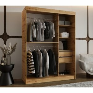 Szafa przesuwna Sento 150 w kolorze dąb artisan to funkcjonalny i elegancki mebel, który łączy dużą pojemność z naturalnym wyglądem drewna. Doskonale sprawdzi się w sypialni lub garderobie, nadając wnętrzu ciepły i przytulny charakter.