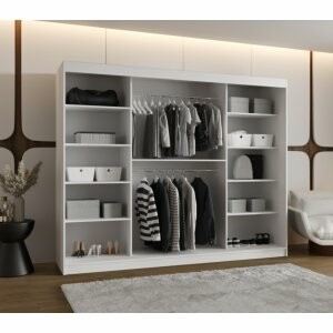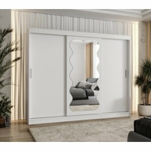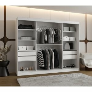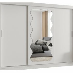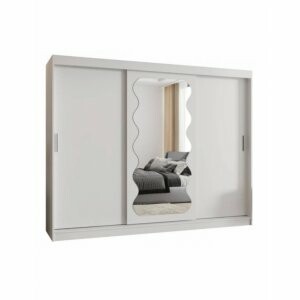 Szafa przesuwna Sento 250 w kolorze białym mat to największy model z tej kolekcji, oferujący imponującą pojemność i funkcjonalność. Dzięki szerokości 250 cm z łatwością pomieści całą garderobę, zapewniając miejsce zarówno na ubrania wiszące, jak i na poskładane elementy odzieży. Przemyślany układ półek i drążków ułatwia organizację, a lustro na froncie dodaje elegancji i optycznie powiększa przestrzeń. To idealny wybór dla osób ceniących przestrzeń, nowoczesny design i wygodę użytkowania.
