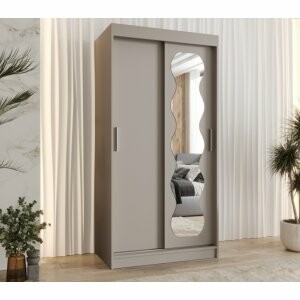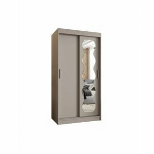 Szafa przesuwna Sento 100 kaszmir to kompaktowe, eleganckie rozwiązanie, które sprawdzi się w mniejszych wnętrzach. Lustro na froncie optycznie powiększa przestrzeń, a układ półek i drążków zapewnia wygodne przechowywanie.