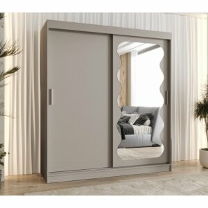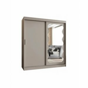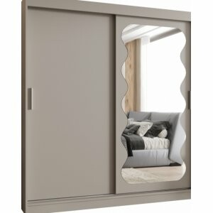 Front z lustrem to zarówno element dekoracyjny, jak i praktyczny – umożliwia kontrolę wyglądu w pełnej sylwetce i sprawia, że wnętrze staje się jaśniejsze i wizualnie większe. Odcień kaszmir to wyjątkowo elegancka i nowoczesna kolorystyka – subtelna, a jednocześnie wyrazista, dzięki czemu szafa świetnie komponuje się zarówno w minimalistycznych aranżacjach, jak i w bardziej klasycznych wnętrzach.
