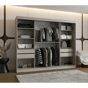 Szafa przesuwna Sento 250 kaszmir to największy i najbardziej pojemny model w tej kolekcji. Jej imponująca szerokość 250 cm sprawia, że bez trudu pomieści całą garderobę – zarówno ubrania codzienne, jak i okrycia wierzchnie, dodatki czy obuwie. To idealne rozwiązanie dla osób, które oczekują maksymalnej przestrzeni i wygody.