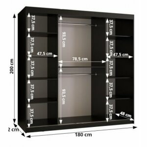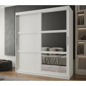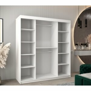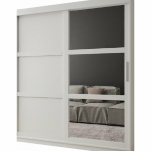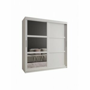 Szafa Spark 180 biały mat to bardzo pojemny model, idealny do większych sypialni i garderób. Lustrzane fronty pięknie odbijają światło, rozjaśniają wnętrze i nadają mu nowoczesnego charakteru, jednocześnie optycznie powiększając przestrzeń. Dzięki drzwiom przesuwnym szafa jest wygodna w użytkowaniu i doskonale sprawdza się także w węższych pomieszczeniach.