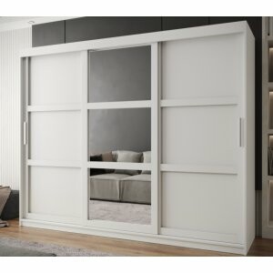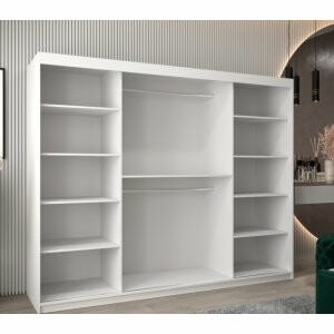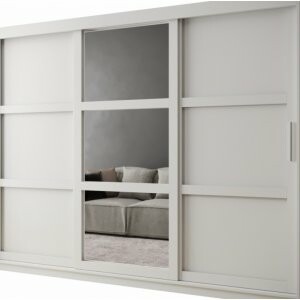 Szafa Spark 250 biały mat to największy model w kolekcji, który zapewnia maksymalną pojemność i doskonałą organizację garderoby. Ogromne lustro na froncie robi wyjątkowe wrażenie – rozświetla wnętrze, nadaje mu elegancji i optycznie powiększa przestrzeń. Dzięki szerokości 250 cm szafa świetnie sprawdzi się w przestronnych sypialniach i garderobach, a system drzwi przesuwnych gwarantuje wygodę codziennego użytkowania.