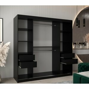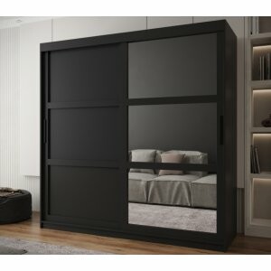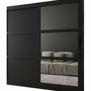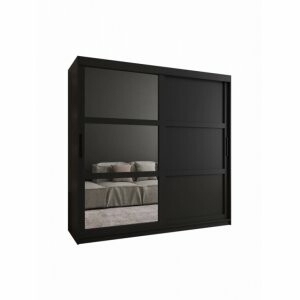 Szafa Spark 200 czarny mat to niezwykle pojemny model, który świetnie sprawdzi się w większych sypialniach i garderobach. Duże, szerokie lustro na froncie daje niesamowity efekt wizualny – rozjaśnia wnętrze i sprawia, że wydaje się znacznie większe. Dzięki drzwiom przesuwnym szafa jest wygodna w użytkowaniu i nie zajmuje dodatkowej przestrzeni przy otwieraniu.