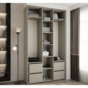 TARO 140 to model, który łączy bardzo dużą pojemność z przemyślanym podziałem wnętrza. Dzięki 12 półkom i 2 drążkom łatwo oddzielisz odzież wiszącą od rzeczy składanych. Uchylne drzwi z cichym domykiem zapewniają wygodne użytkowanie, a możliwość dodatkowej rozbudowy (półki i szuflady) pozwala na stworzenie idealnie dopasowanego systemu przechowywania.