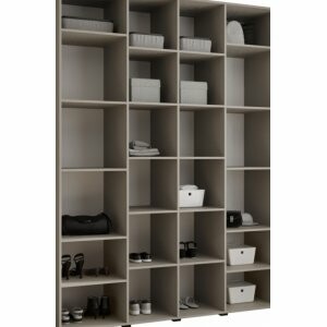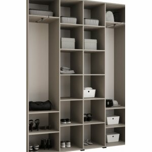 Cztery szerokie drzwi uchylne na zawiasach z systemem cichego domyku HETTICH zapewniają wygodny i bezgłośny dostęp do całego wnętrza. Środkowy moduł zawiera aż 12 półek, które oferują ogromną przestrzeń na odzież i akcesoria, natomiast w bocznych częściach znajdują się 2 wysuwane, metalowe drążki oraz dodatkowe półki, dzięki którym organizacja garderoby jest prosta i intuicyjna.