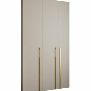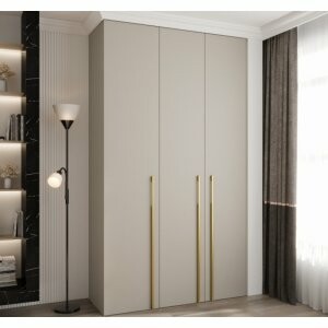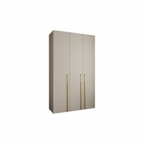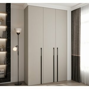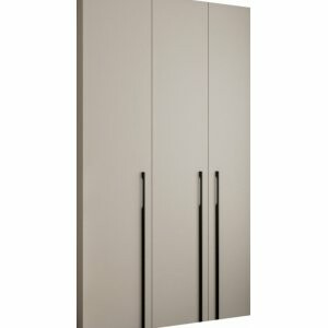 TARO DUO 140 w kolorze kaszmir to trzydrzwiowa szafa o dużej pojemności, która idealnie sprawdzi się w sypialni lub garderobie. Matowe fronty w ciepłym, przytulnym odcieniu kaszmir nadają wnętrzu elegancji i harmonii, a smukłe uchwyty w kolorze złotym lub czarnym podkreślają nowoczesny charakter mebla.