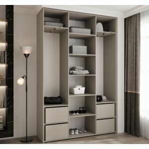 Szafa TARO 160 kaszmir to przestronna, 3-drzwiowa garderoba, która łączy elegancki wygląd z praktycznym układem wnętrza. Dzięki 12 półkom i 2 drążkom łatwo uporządkujesz odzież, a możliwość personalizacji (głębokość, uchwyty, półki i szuflady) sprawia, że dopasujesz mebel do swojego wnętrza i własnych potrzeb.