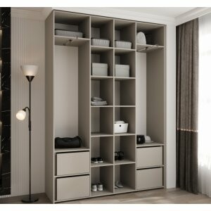 TARO 170 kaszmir to imponująca, czterodrzwiowa szafa, która oferuje maksymalną pojemność przy zachowaniu eleganckiego wyglądu. Dzięki 12 półkom w środkowym module oraz drążkom po bokach łatwo utrzymasz porządek w garderobie. To idealny wybór do przestronnych sypialni i garderób, w których liczy się zarówno estetyka, jak i funkcjonalność.