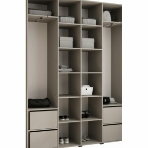 – po 3 półki w bocznych sekcjach – dodatkowe miejsce na swetry, buty czy pudełka
