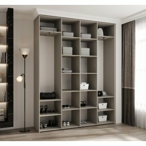 TARO 190 kaszmir to jeszcze bardziej przestronna wersja szafy 4-drzwiowej, która świetnie sprawdzi się w dużych pomieszczeniach. 12 półek w centralnym module i drążki po bokach gwarantują perfekcyjny porządek i łatwy dostęp do garderoby. To propozycja dla osób ceniących sobie zarówno funkcjonalność, jak i elegancki, nowoczesny design.