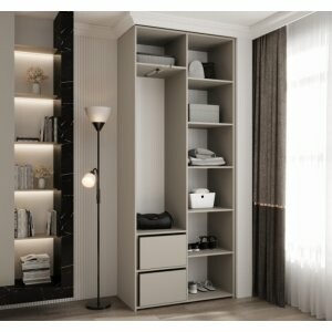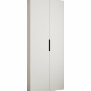 Model ten został zaprojektowany z myślą o funkcjonalności – 2 drzwi uchylne na zawiasach z systemem cichego domyku HETTICH zapewniają ciche i komfortowe użytkowanie. W standardzie szafa jest wyposażona w wysuwany, metalowy drążek na odzież wiszącą oraz 9 półek skręconych na stałe, co pozwala na wygodne rozdzielenie ubrań, akcesoriów i tekstyliów.