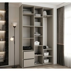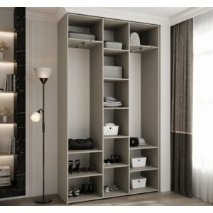 Model ten zapewnia wygodny dostęp do wnętrza dzięki 3 drzwiom uchylnym na zawiasach z systemem cichego domyku HETTICH. W standardzie szafa wyposażona jest w 2 wysuwane, metalowe drążki po bokach oraz 12 półek – po 3 w bocznych modułach i 6 w centralnej części – co pozwala na uporządkowanie zarówno ubrań wiszących, jak i składanych.
