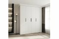 Cztery szerokie drzwi uchylne na zawiasach z systemem cichego domyku HETTICH umożliwiają wygodny i bezgłośny dostęp do całego wnętrza. Funkcjonalne wnętrze obejmuje 2 wysuwane, metalowe drążki po bokach, po 3 półki w bocznych modułach oraz aż 12 półek w centralnym module, co daje ogromną ilość miejsca na ubrania, tekstylia i dodatki.