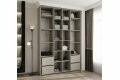 Cztery drzwi uchylne na zawiasach z systemem cichego domyku HETTICH zapewniają wygodny i bezgłośny dostęp do wnętrza. Rozbudowany układ wnętrza obejmuje 2 wysuwane, metalowe drążki po bokach oraz po 3 półki w bocznych sekcjach, a środkowy moduł mieści aż 12 półek, co daje ogromną przestrzeń do przechowywania odzieży składanej, obuwia i akcesoriów.