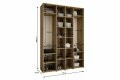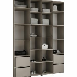 Cztery szerokie drzwi uchylne na zawiasach z systemem cichego domyku HETTICH zapewniają wygodny i bezgłośny dostęp do całego wnętrza. Standardowy układ obejmuje 2 wysuwane, metalowe drążki po bokach oraz po 3 półki w bocznych modułach, a środkowy moduł mieści aż 12 półek, co pozwala na perfekcyjną organizację ubrań, obuwia i dodatków.