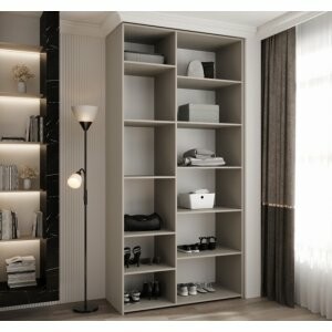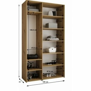 Dzięki większej szerokości i trzem drzwiom TARO LUX 120 gwarantuje komfortowy dostęp do całej zawartości szafy. Jej elegancka forma i nowoczesne wykończenie sprawiają, że będzie nie tylko praktycznym meblem, ale i dekoracyjnym elementem wnętrza, podkreślającym jego jasny, minimalistyczny charakter.