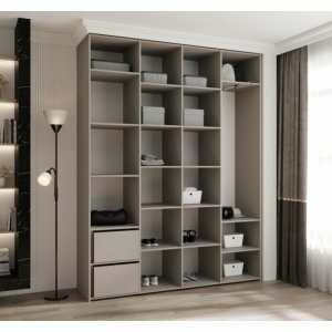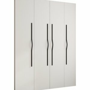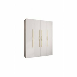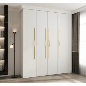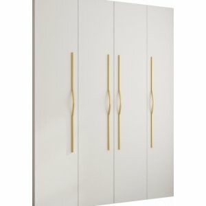 TARO LUX 190 to imponująca czterodrzwiowa szafa, która łączy nowoczesny wygląd z wyjątkową funkcjonalnością. Matowe, białe fronty dodają wnętrzu elegancji i świeżości, a wysokie, smukłe uchwyty w kolorze złotym lub czarnym nadają jej subtelnego, luksusowego charakteru. Dzięki szerokiej formie i czterem drzwiom uchylnym dostęp do całego wnętrza jest wygodny i bezproblemowy, co ułatwia utrzymanie porządku w garderobie.
