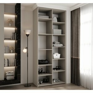 TARO LUX 100 w kolorze kaszmir to elegancki mebel, który wprowadza do wnętrza ciepło i subtelny charakter. Matowe fronty w odcieniu kaszmir doskonale komponują się z jasnymi i naturalnymi aranżacjami, a wysokie, smukłe uchwyty w kolorze złotym lub czarnym dodają całości wyjątkowego, luksusowego akcentu. Szafa łączy kompaktowy rozmiar z wysoką funkcjonalnością, co czyni ją idealnym wyborem do sypialni, przedpokoju czy mniejszej garderoby.