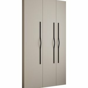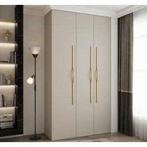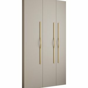 TARO LUX 130 w kolorze kaszmir to szafa, która oferuje jeszcze więcej miejsca na garderobę, zachowując elegancki, smukły wygląd. Matowe fronty w ciepłym odcieniu kaszmir nadają wnętrzu przytulności, a długie, wąskie uchwyty w kolorze złotym lub czarnym wprowadzają nutę luksusu i podkreślają nowoczesny charakter mebla. Trzy szerokie drzwi uchylne umożliwiają wygodny dostęp do całego wnętrza, co sprawia, że codzienne korzystanie z szafy jest niezwykle komfortowe.