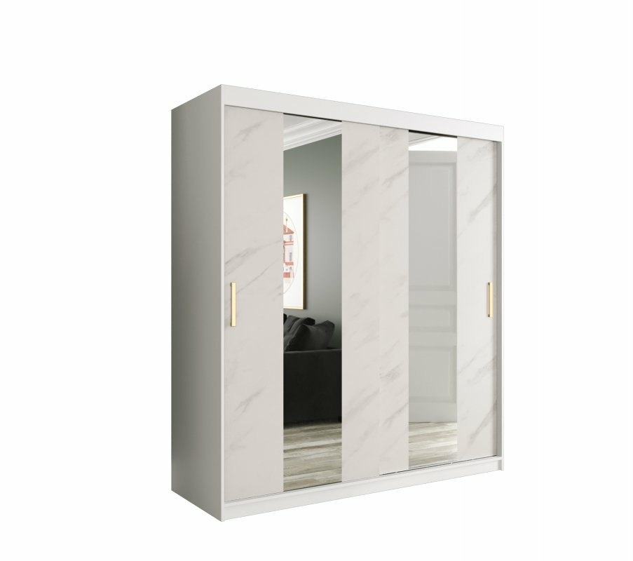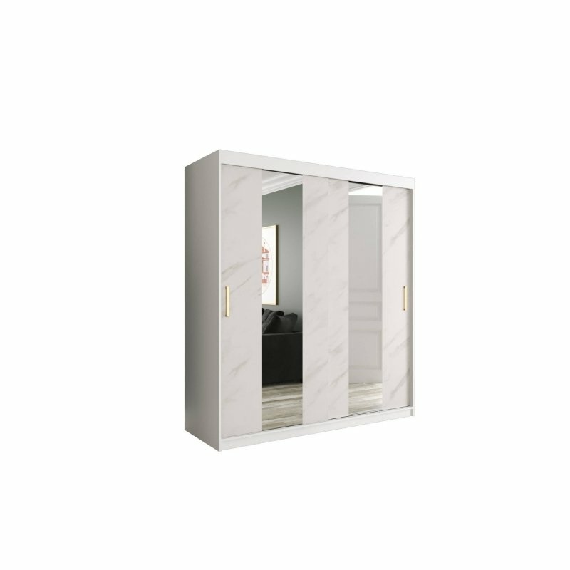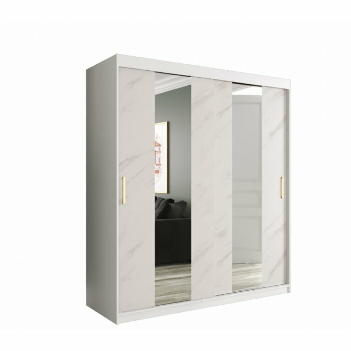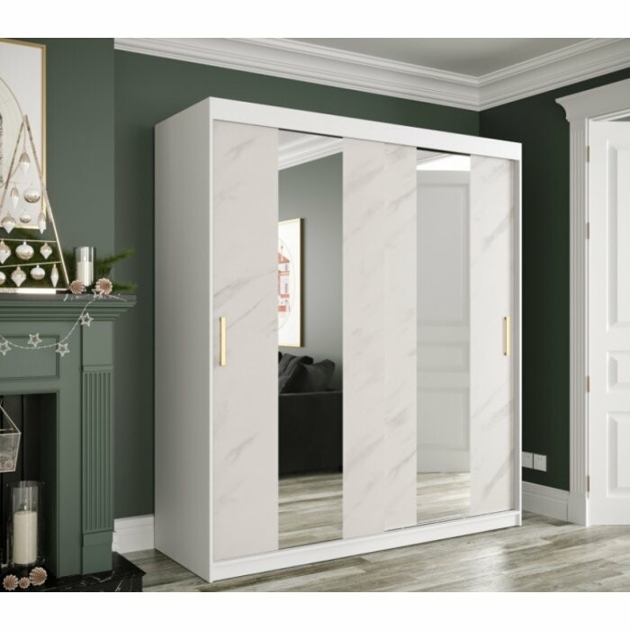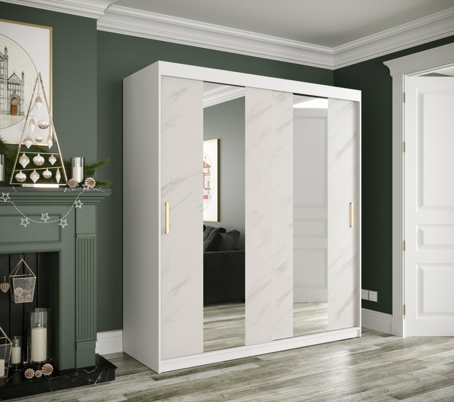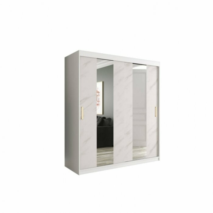 Travero Line 180 to duża, elegancka szafa przesuwna, która zachwyca frontami w dekorze marmuru z pionowymi lustrzanymi pasami. Taki układ nie tylko dodaje wnętrzu nowoczesnego charakteru, ale również rozświetla i optycznie powiększa przestrzeń. To idealny wybór do większych sypialni i garderób, w których liczy się zarówno pojemność, jak i design.
