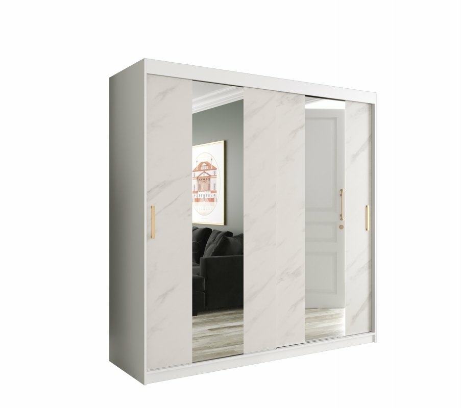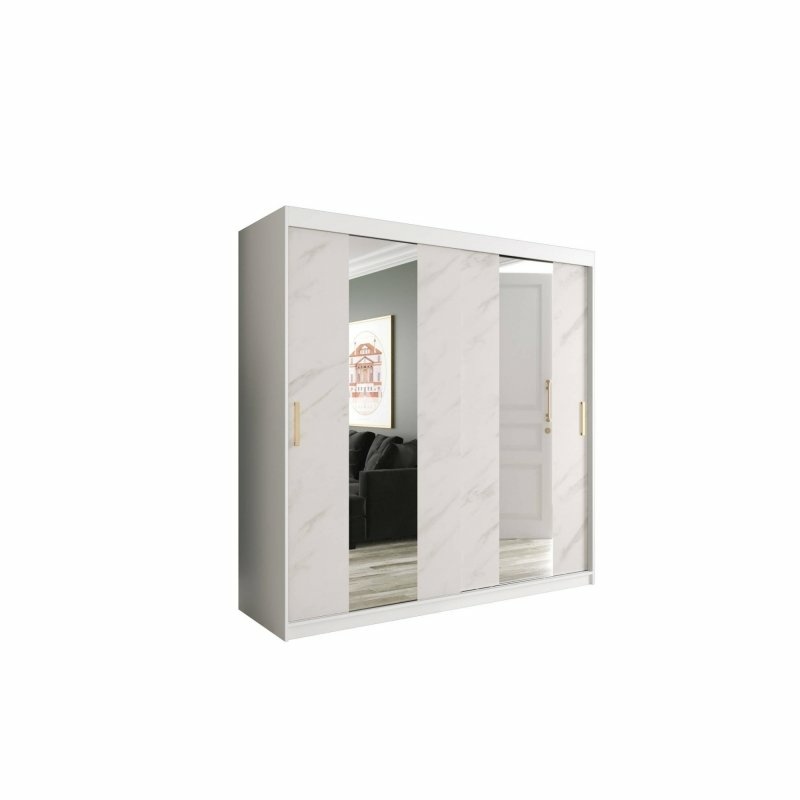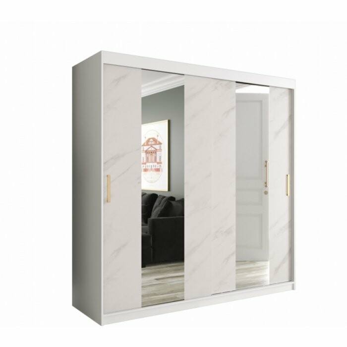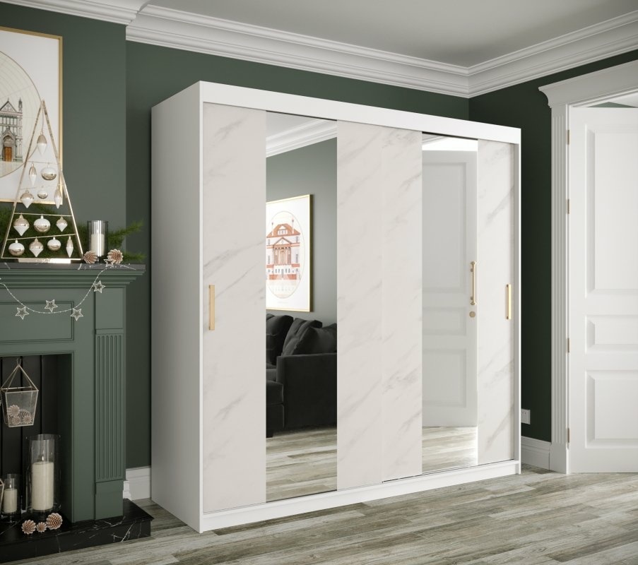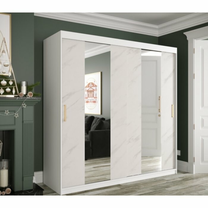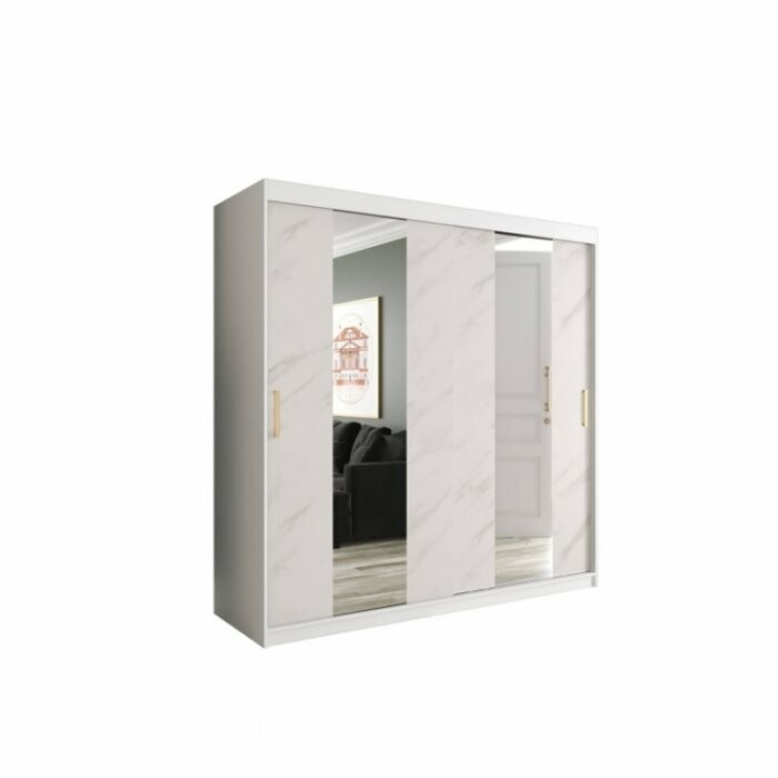 Travero Line 200 to wyjątkowo pojemna szafa przesuwna, która łączy fronty w dekorze marmuru z pionowymi lustrzanymi pasami. Dzięki takiemu projektowi mebel prezentuje się elegancko i nowocześnie, a lustra optycznie powiększają przestrzeń i rozświetlają wnętrze. To idealny wybór do większych sypialni i garderób, gdzie liczy się zarówno estetyka, jak i funkcjonalność.