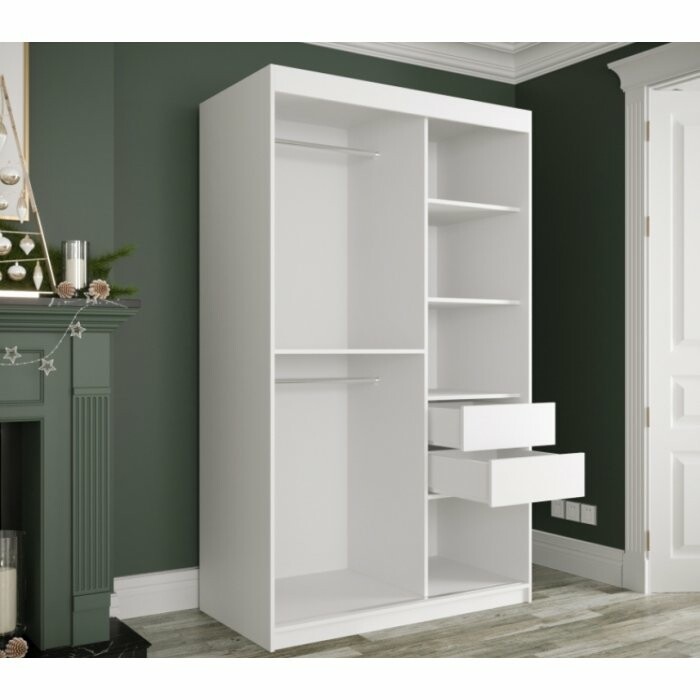 Travero Lux 120 to elegancka i funkcjonalna szafa przesuwna, która dzięki centralnie umieszczonemu, dzielonemu lustrze wprowadza do wnętrza wrażenie przestronności i lekkości. Lustro zajmuje większą powierzchnię niż w wersji 100 cm, przez co jest jeszcze bardziej praktyczne i dekoracyjne.