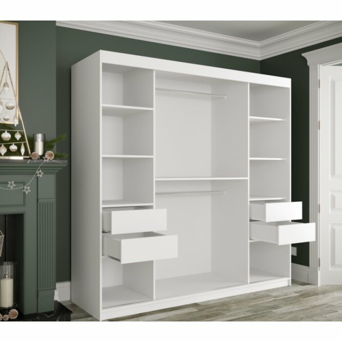 Travero Lux 200 to bardzo pojemna szafa przesuwna, która dzięki szerokiemu, dzielonemu lustru umieszczonemu centralnie nadaje wnętrzu elegancji i optycznie je powiększa. To świetny wybór dla osób, które chcą połączyć funkcjonalność z nowoczesnym wyglądem.