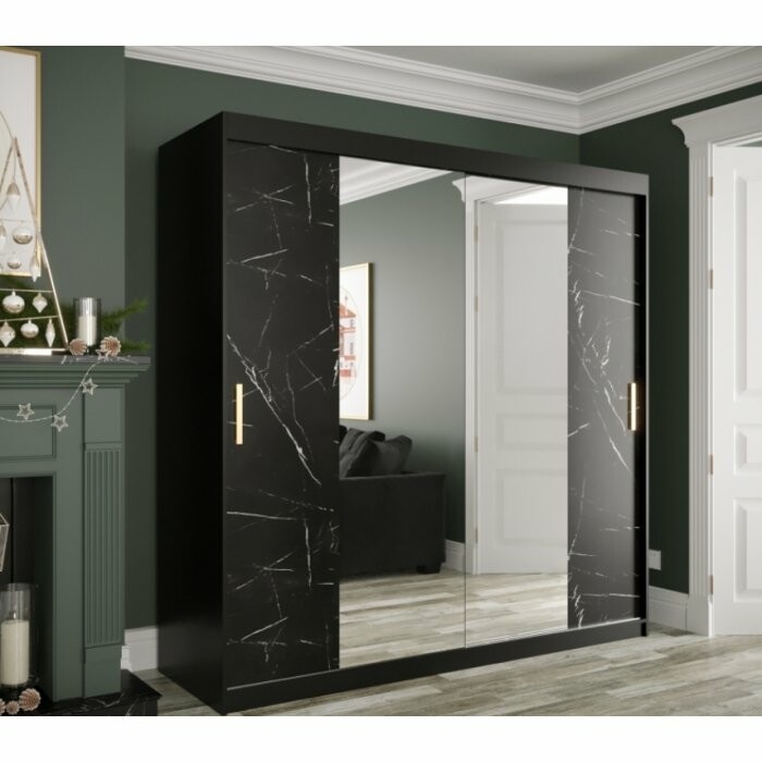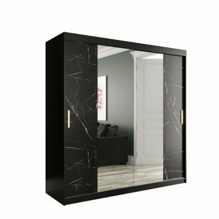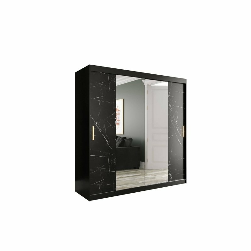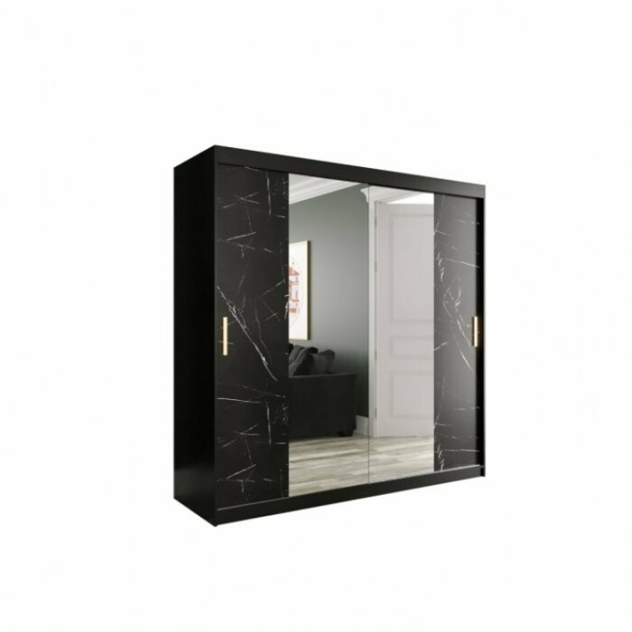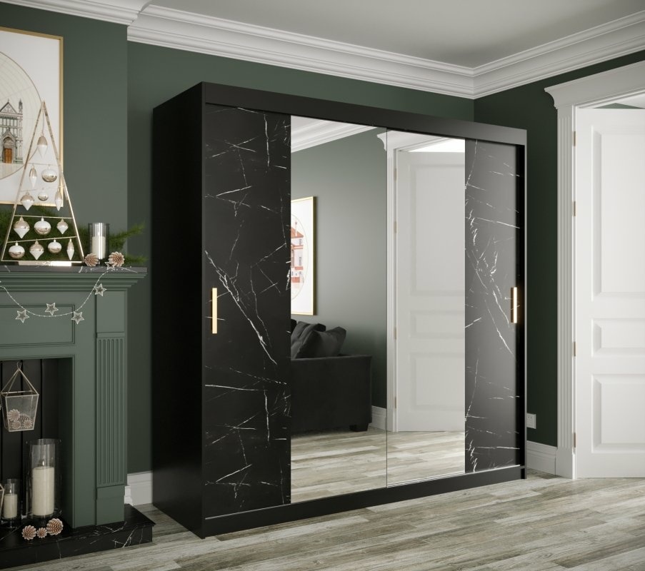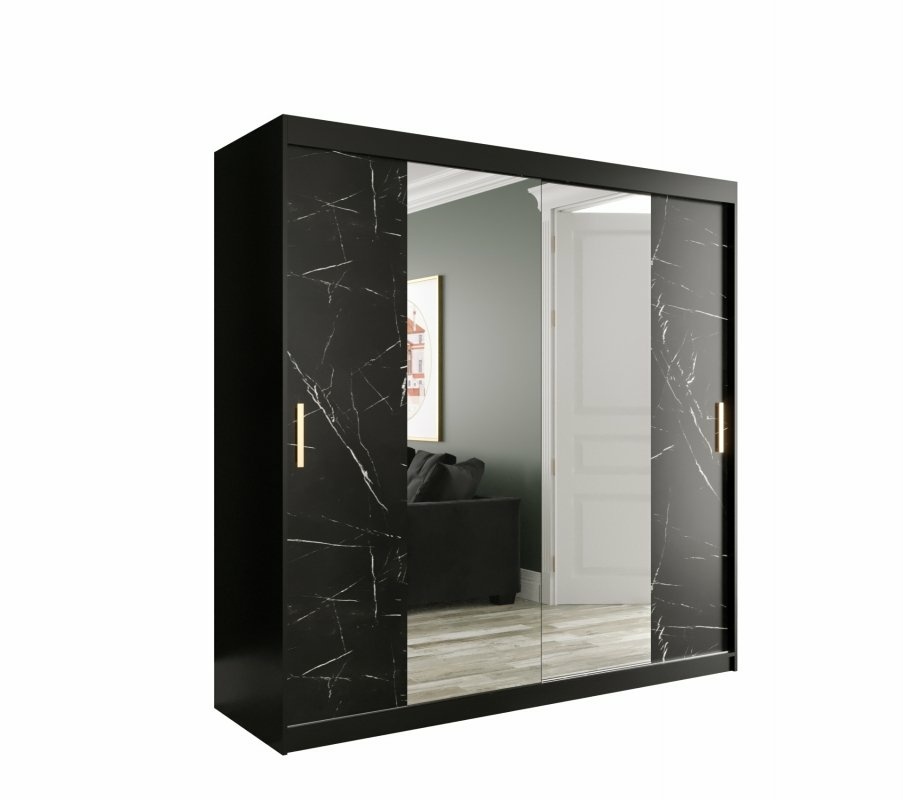 Szafa przesuwna Travero Lux 200 – czarny mat + fronty marmurowe czarne z lustrem pośrodku